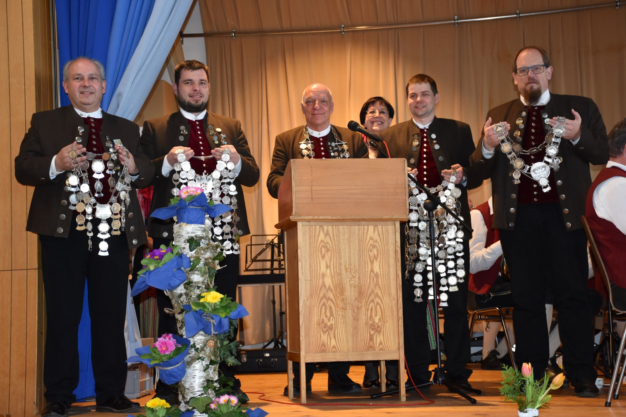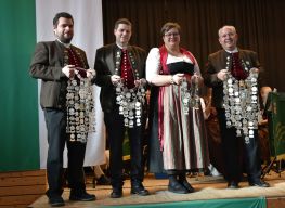 Abordnungen der scheidenden Majestäten und der künftigen Regenten waren dazu aus ganz Schwaben angereist. Das Bürgerhaus war bis auf den letzten Platz besetzt, als 1. Bezirksschützenmeister Karl Schnell zusammen mit seinem Bezirksschützenmeisteramt, das Geheimnis der Königswürde 2017 lüftete.