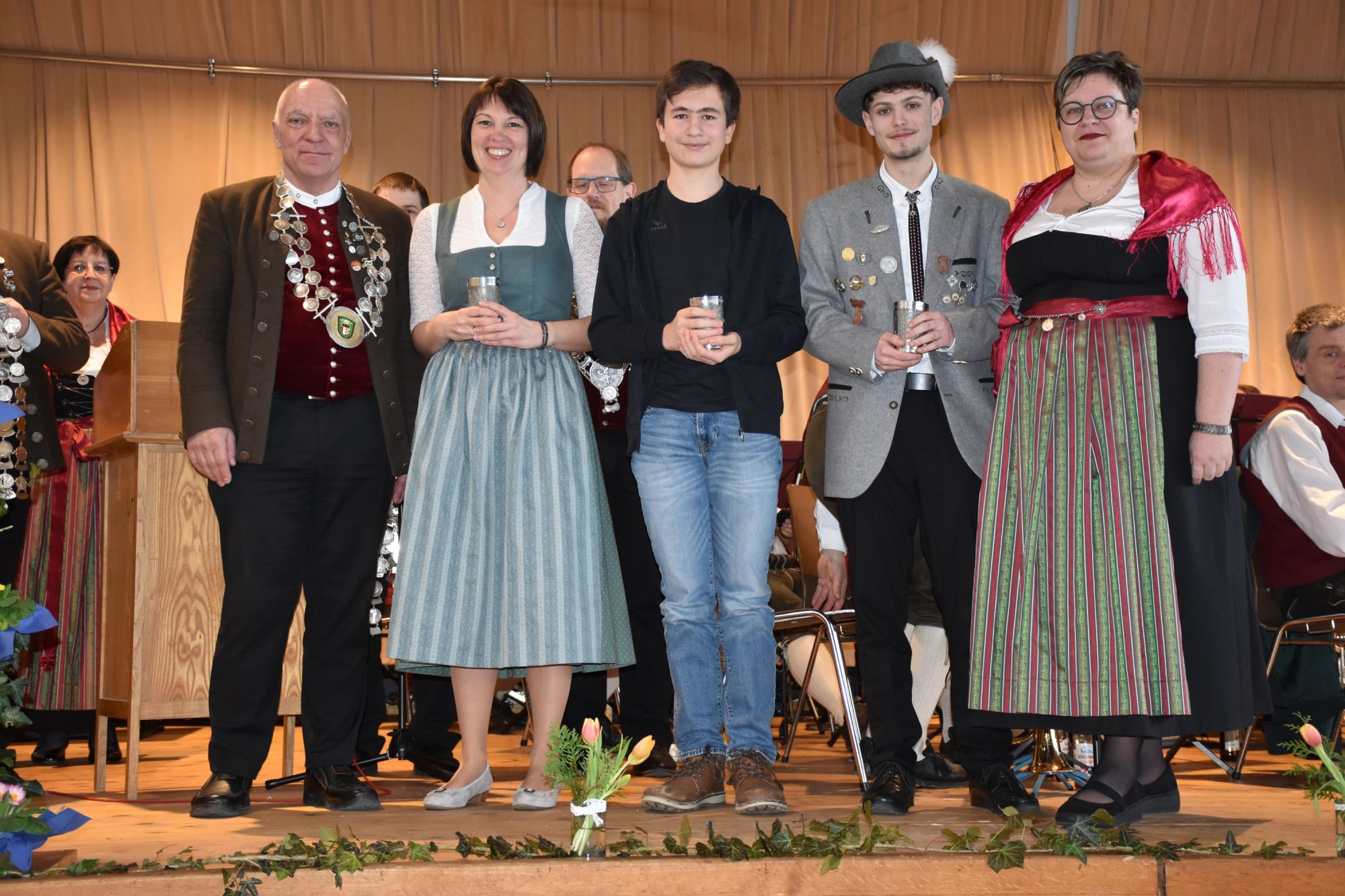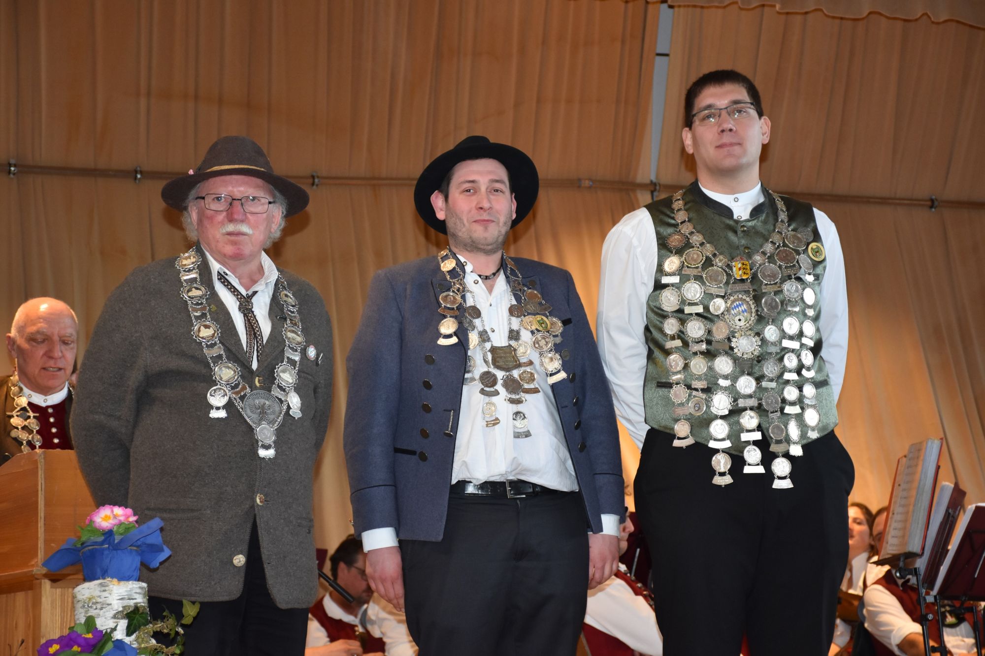 Nach den Grußworten hieß es Abschied nehmen von den scheidenden Königen, Manfred Egger, Bezirksschützenkönig, Erik Dolpp, Bezirksjugendkönig, Silas Kienle, Bezirkspistolenkönig und Helmut Späth, Bezirksauflagekönig. Sie alle wurde zum Abschied mit einem Präsent und der Königsnadel verabschiedet.