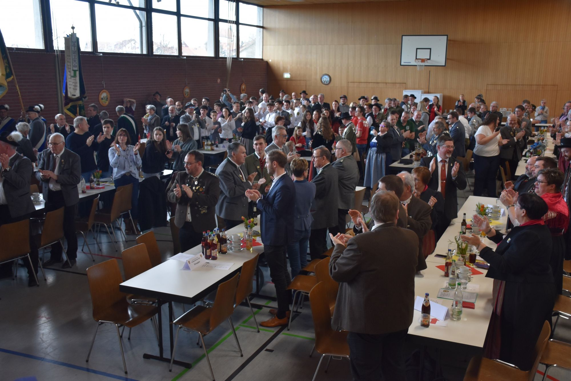 Tosender Applaus aus dem gesamten Saal begleitete jeweils die neuen Bezirksschützenkönige auf die Bühne, als es dann hieß: