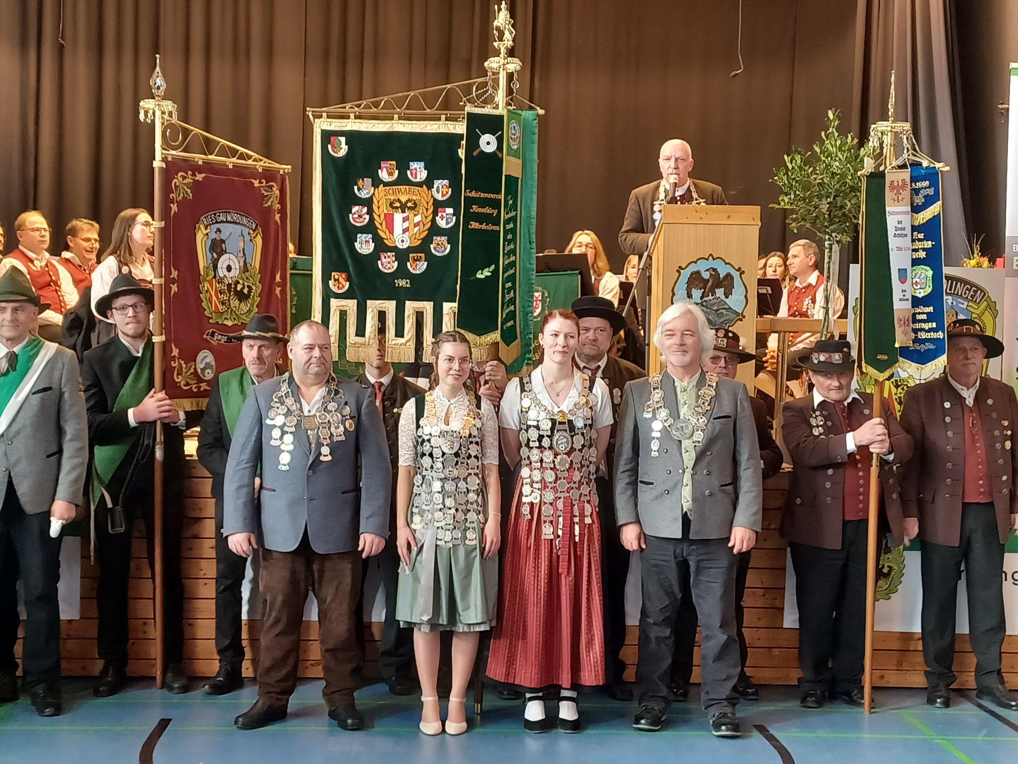 Wertingen, 11.02.2023| An diesem Wochenende fand zum ersten Mal nach der Corona-Pandemie wieder die Proklamation der neuen Schützenkönige statt. Zwei Jahre musste auch diese Feierlichkeit pausiert werden, nun konnten die ehemaligen Schützenkönig:innen von 2019 ihre Regentschaft an die neuen Schützenkönige 2022 übergeben. Organisiert wurde die durchwegs gelungene Veranstaltung vom Gau Wertingen mit seinem Gauschützenmeister Hubert Gerblinger. Die feierliche, aber ebenfalls ausgelassene Stimmung war nicht zuletzt auch der hervorragenden musikalischen Begleitung der Musikkapelle >UNS< mit ihrem Dirigenten Johann Havel zu verdanken, die schon beim Eintreffen alle Gäste musikalisch willkommen hieß.