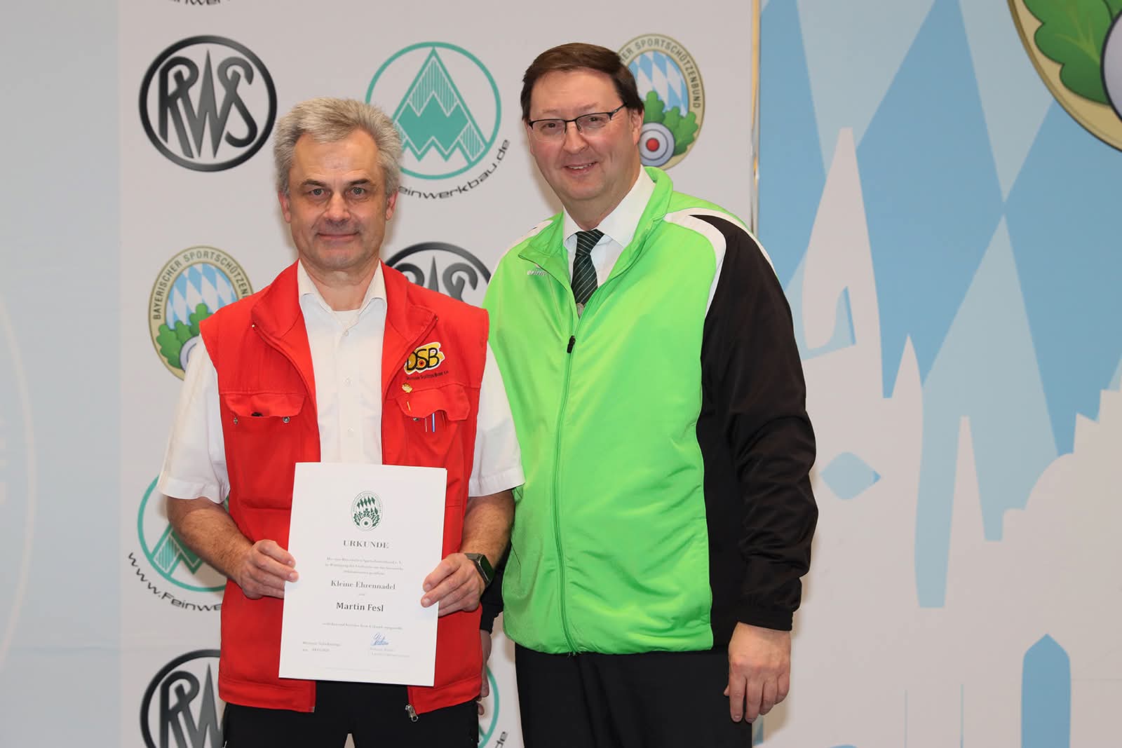 Aus den Händen vom 1. Landesschützenmeister Christian Kühn erhielt Martin Fesl die kleine Ehrennadel vom Bayerischen Sportschützenbund für seinen unermüdlichen Einsatz als Kampfrichter. (beide Bilder BSSB)
