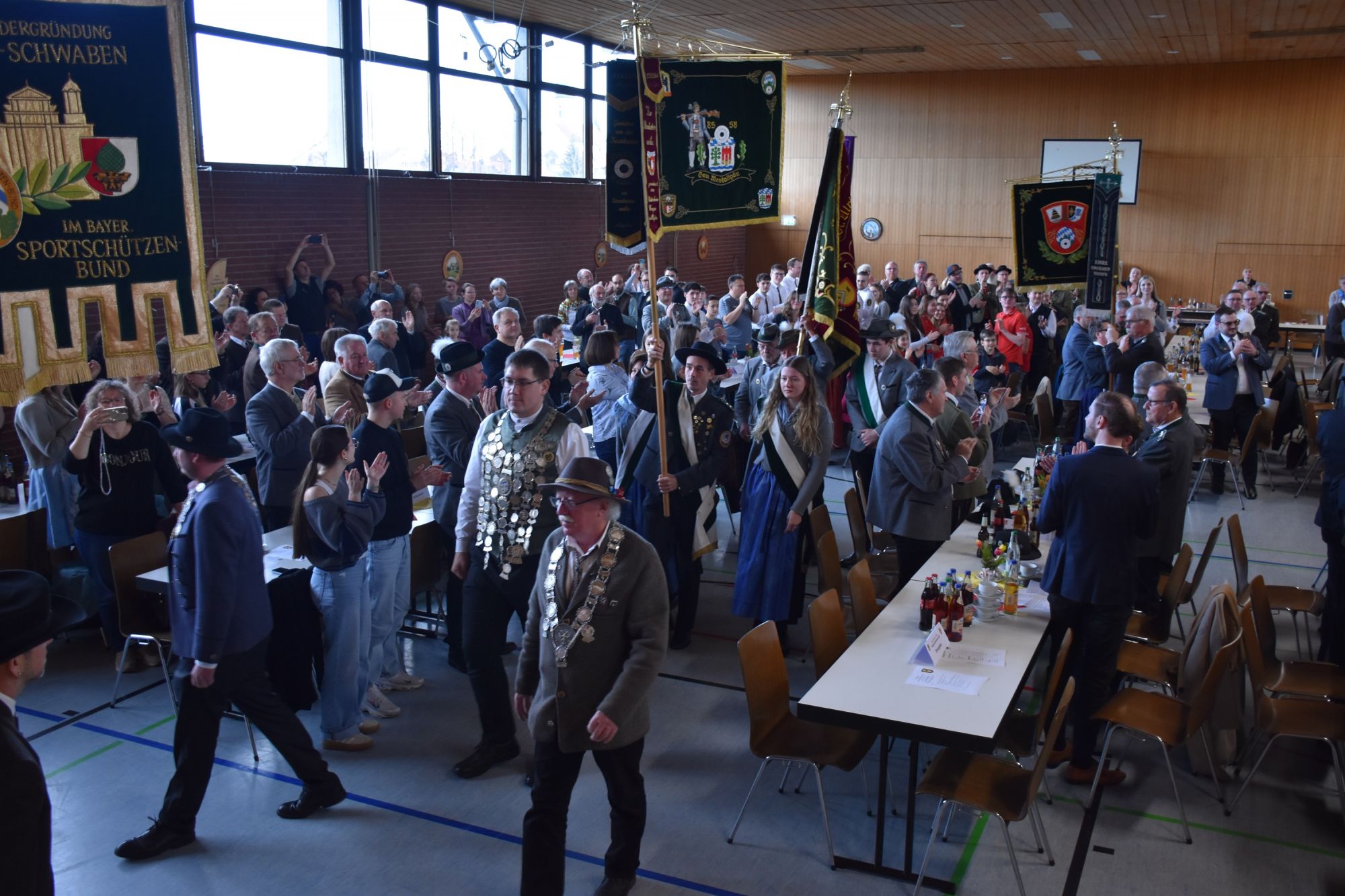 Böllerschüsse der Kgl. priv. SG Nassenbeuren und ein stimmungsvoller Fahneneinzug in das FORUM in Mindelheim gingen der Begrüßung von 1. Bezirksschützenmeister Karl Schnell zur Königsproklamation des Bezirkes Schwaben voraus. In dem mit ca. 300 Personen vollbesetzten Saal gratulierten dann die politischen Ehrengäste stv. Landrat und Bürgermeister Dr. Stephan Winter, MdB Stephan Stracke und MdL Bernhard Pohl den kommenden Majestäten zu ihren hervorragenden Ergebnissen.