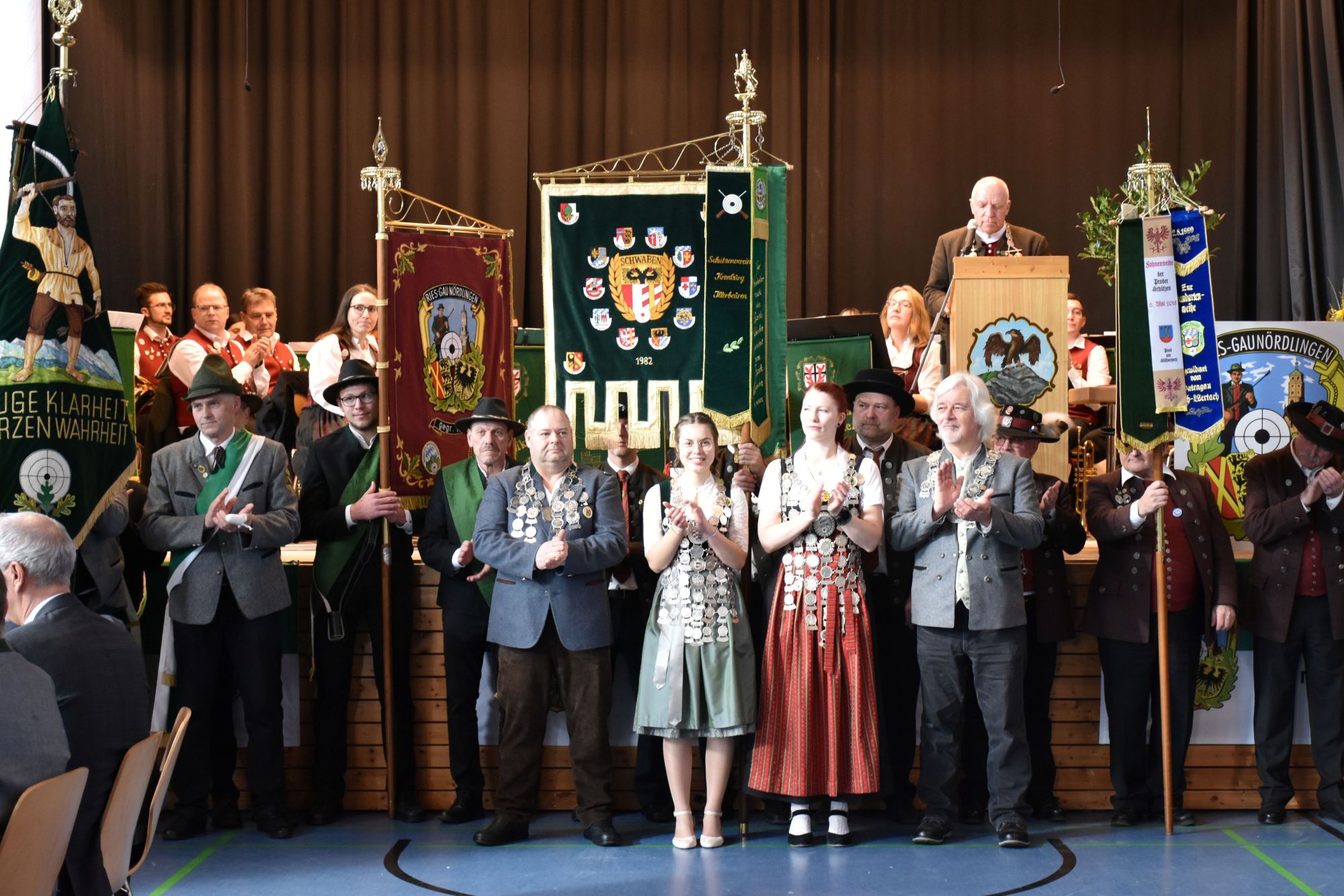 Abordnungen der scheidenden Majestäten und der künftigen Regenten waren dazu aus ganz Schwaben angereist. Das Bürgerhaus war bis auf den letzten Platz besetzt, als 1. Bezirksschützenmeister Karl Schnell zusammen mit seinem Bezirksschützenmeisteramt, das Geheimnis der Königswürde 2017 lüftete.